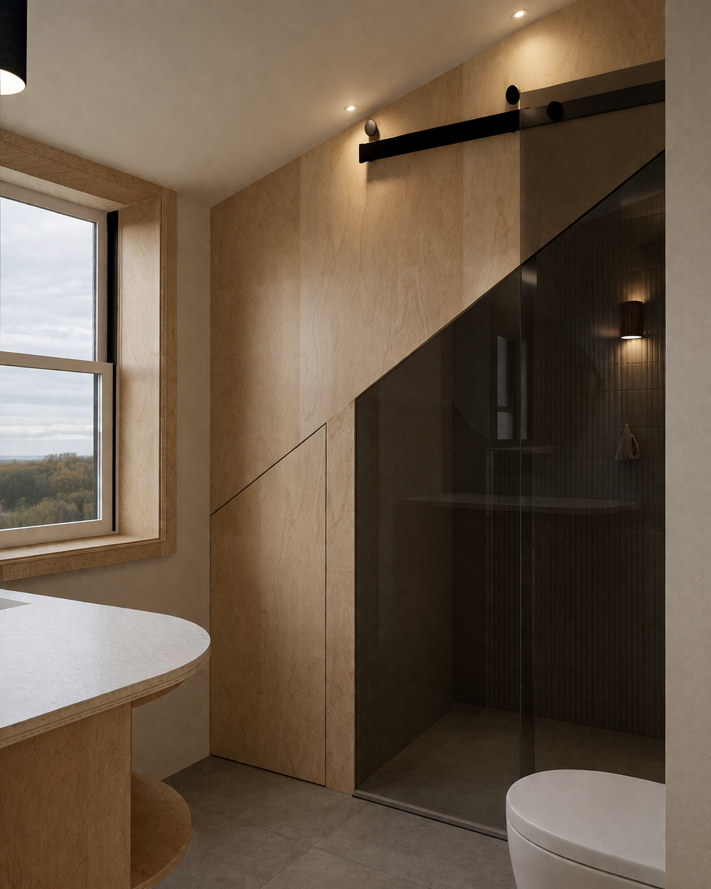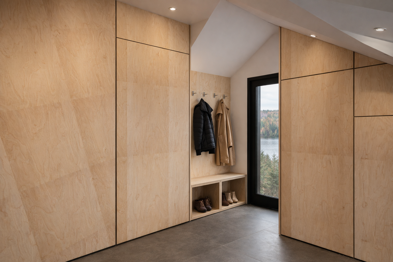 Le concept s'articule autour de l'idée de refuge nordique : un volume continu, structuré par les usages plutôt que par les cloisons, pensé comme un abri lisible et calme. Trois mots-clés en définissent l'esprit : continuité, sérénité, simplicité.