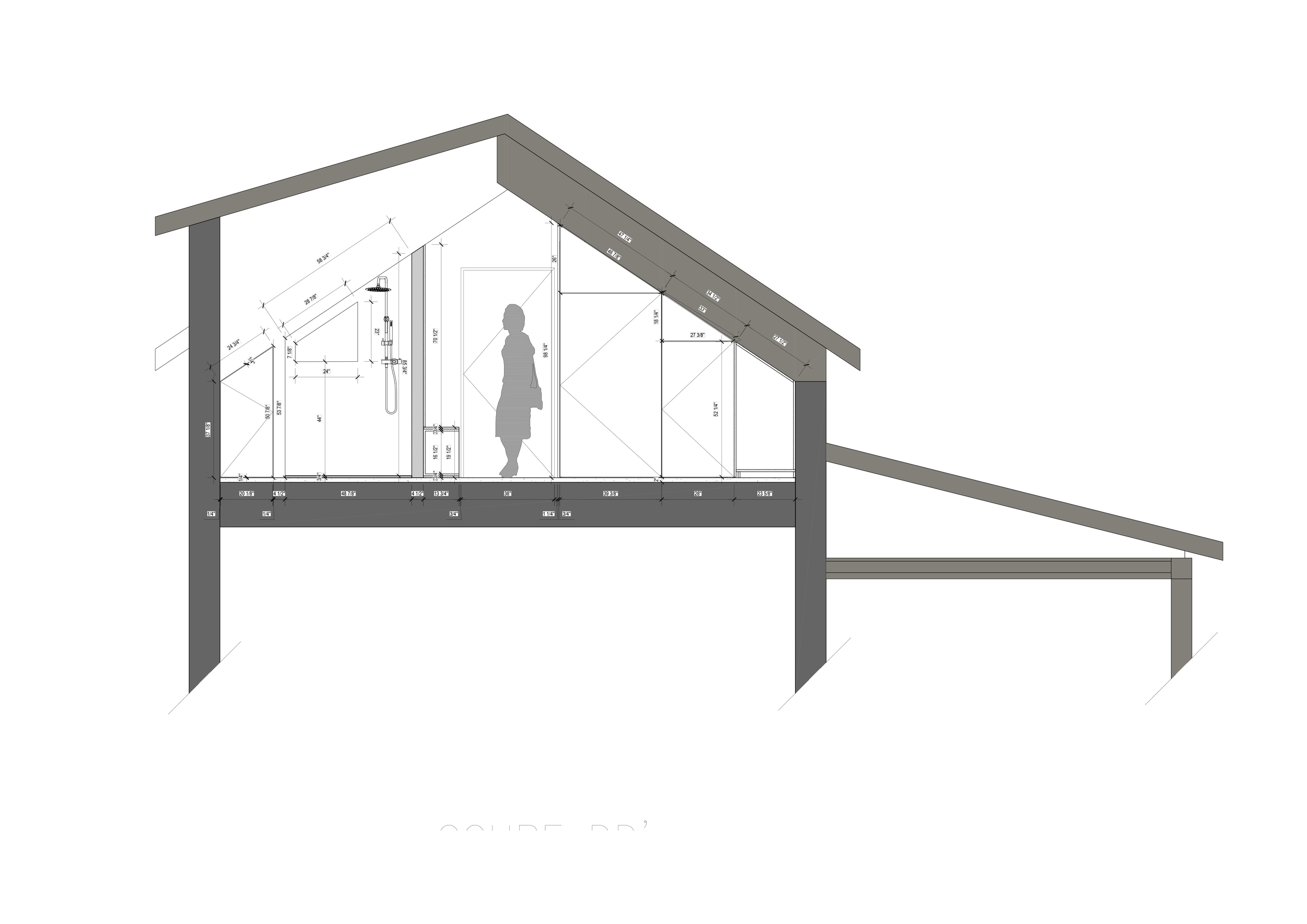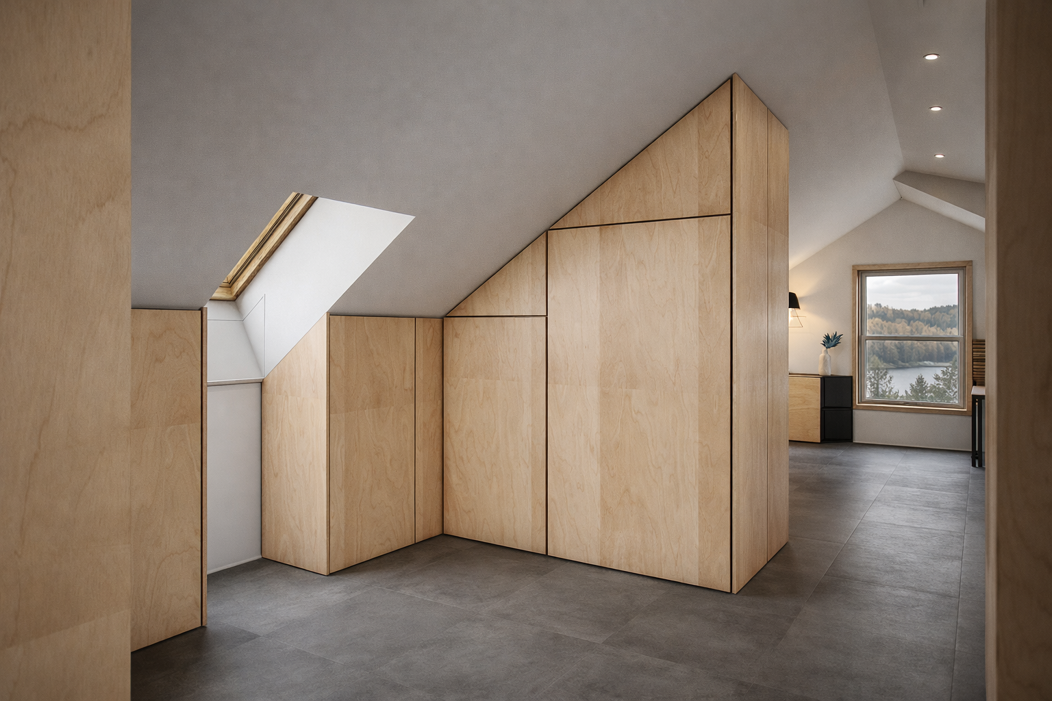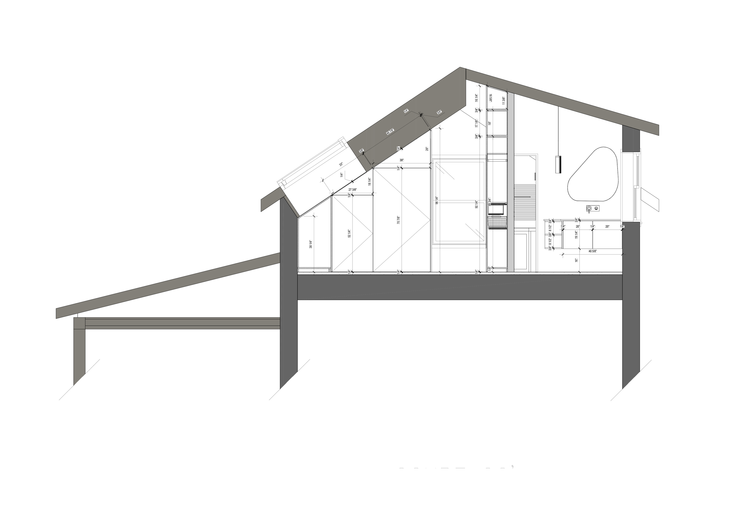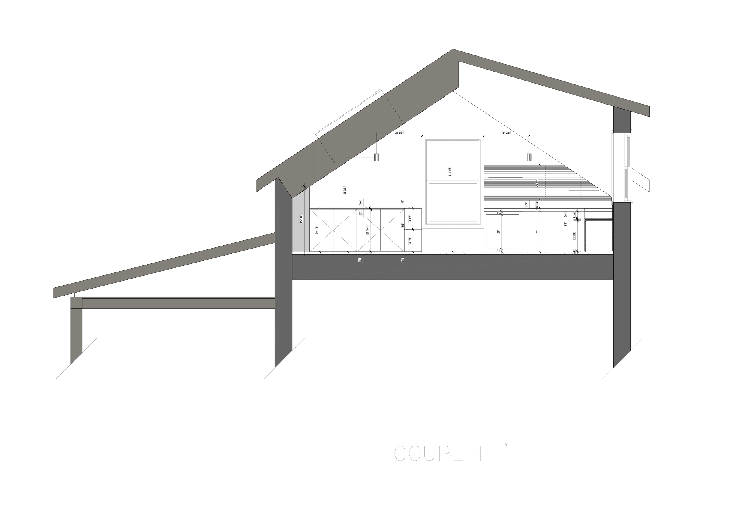 Le mobilier intégré occupe une place centrale dans l'écriture du projet : banquette d'angle avec coffres de rangement sur mesure, placards sous pente, vanité suspendue, crédence-étagère, buffet et bureau pensés comme des prolongements du bâti. Architecture et mobilier se confondent — chaque centimètre est habité, sans ostentation.Un jeu fin de shadow gaps (1/4" et 3/4") donne au mobilier sa précision et sa retenue.