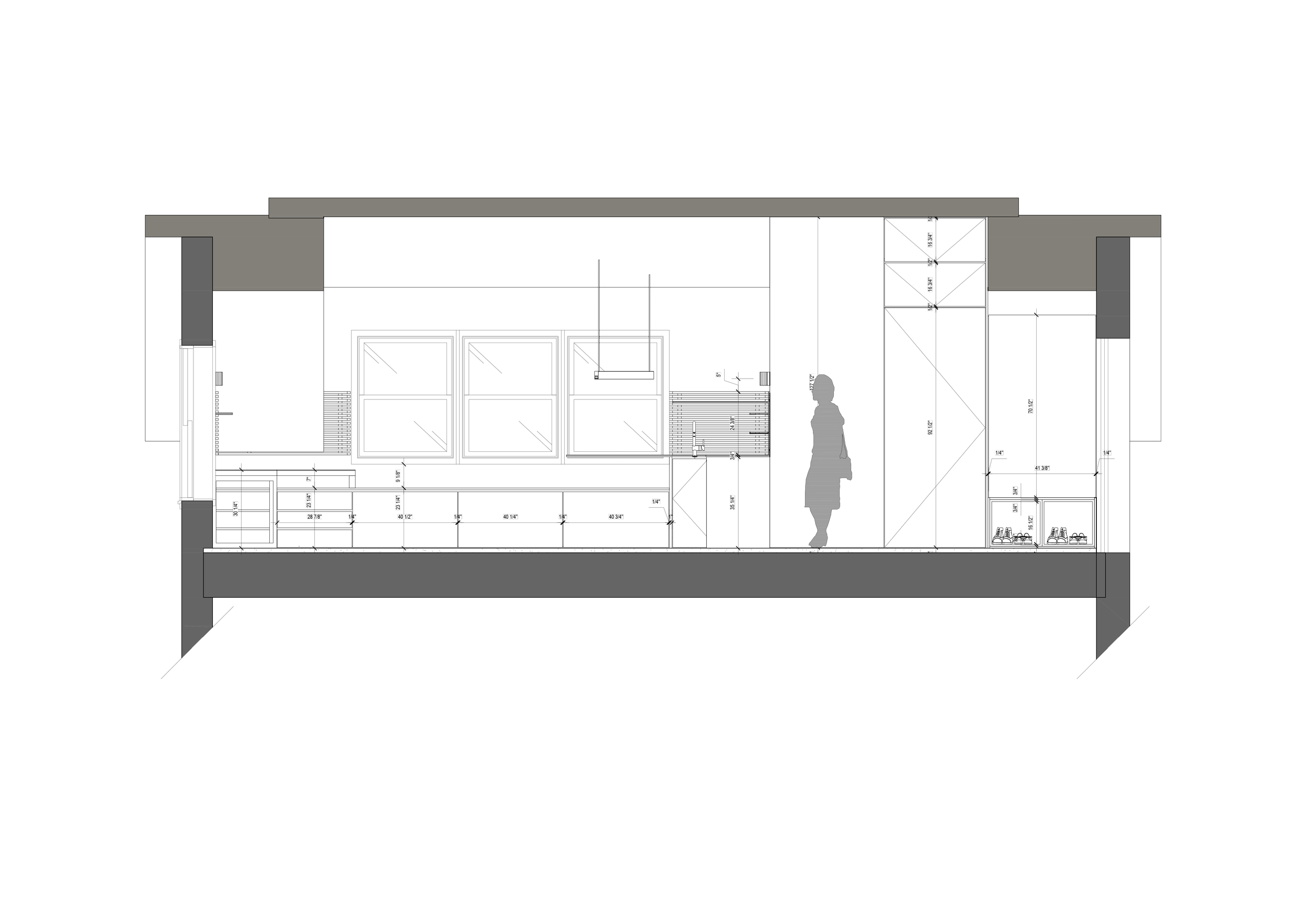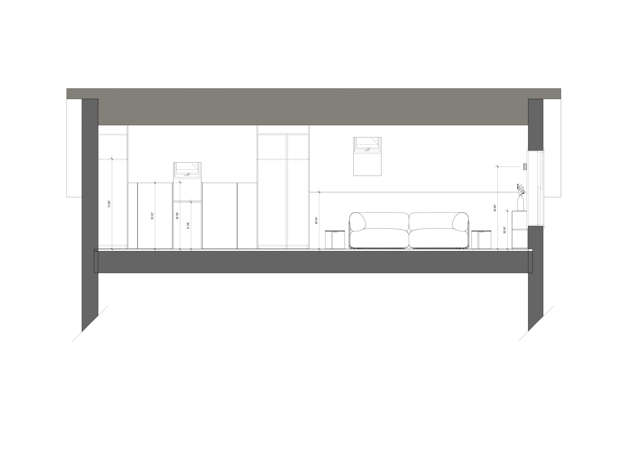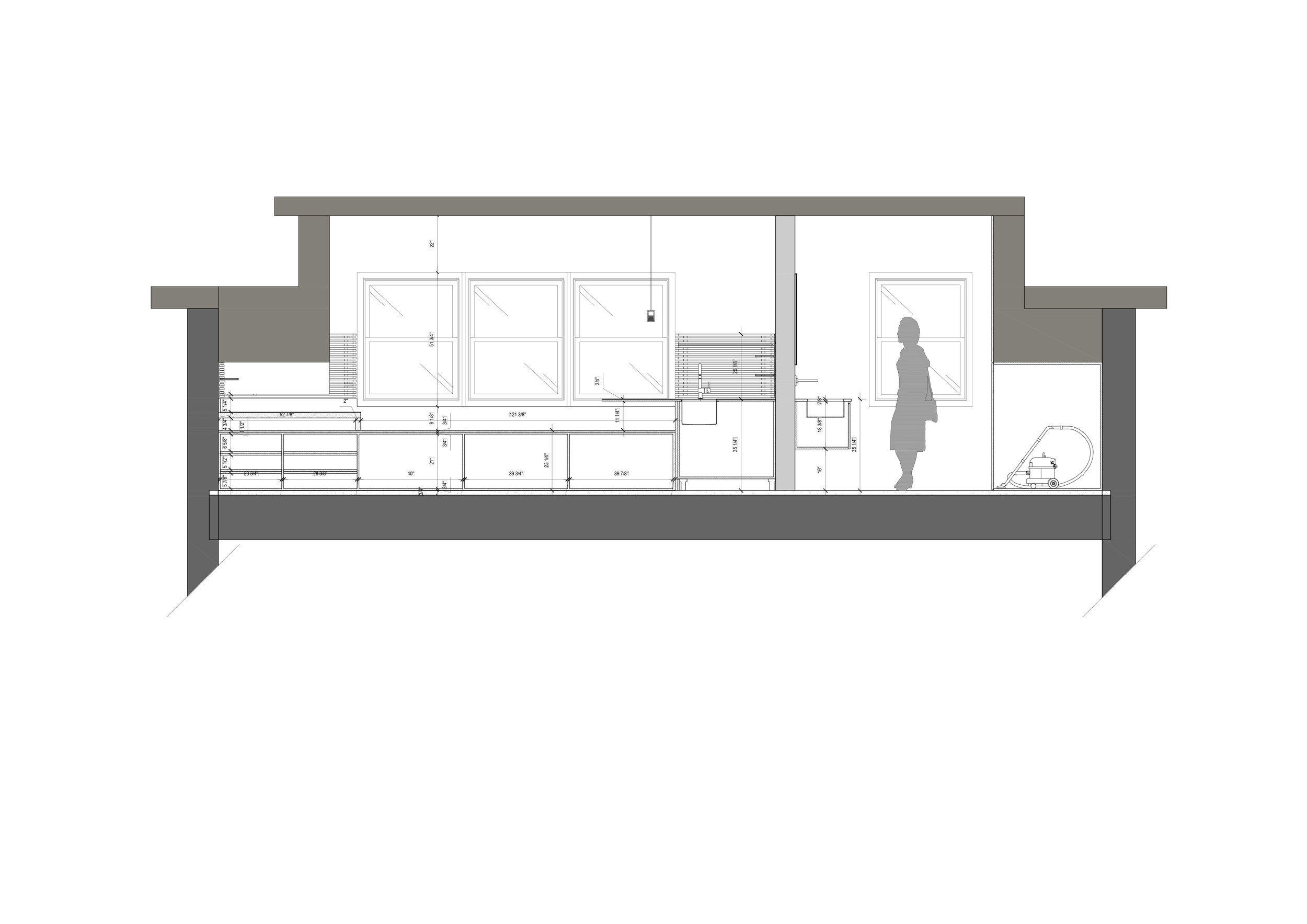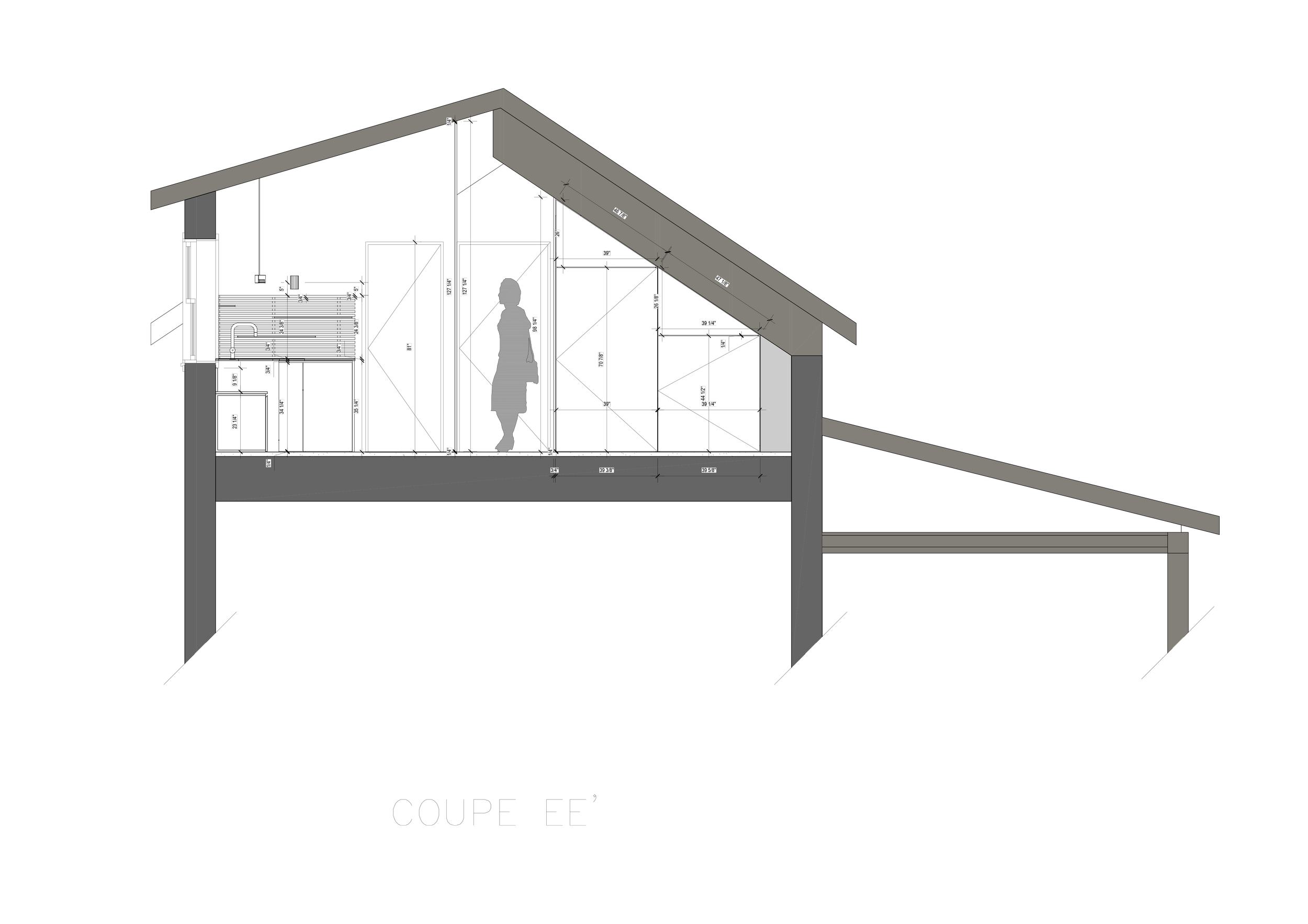 Le mobilier intégré occupe une place centrale dans l'écriture du projet : banquette d'angle avec coffres de rangement sur mesure, placards sous pente, vanité suspendue, crédence-étagère, buffet et bureau pensés comme des prolongements du bâti. Architecture et mobilier se confondent — chaque centimètre est habité, sans ostentation.Un jeu fin de shadow gaps (1/4" et 3/4") donne au mobilier sa précision et sa retenue.