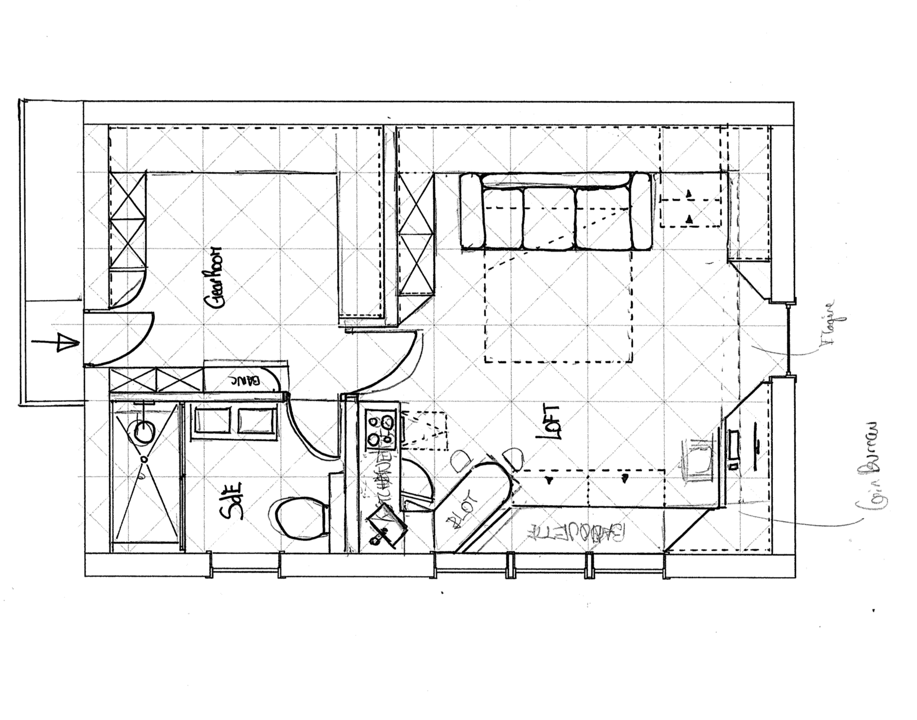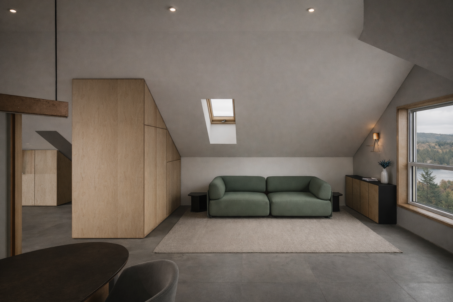 L'intervention prend le parti d'un grand volume central dégagé, où chaque fonction trouve sa place sans rupture. Les circulations sont volontairement directes, la salle d'eau réimplantée pour gagner en confort d'usage, le gear room intégré au volume principal comme une extension fonctionnelle. L'ensemble repose sur une logique de continuité — des circulations, des matériaux et des volumes — où chaque zone reste identifiable sans jamais être isolée.