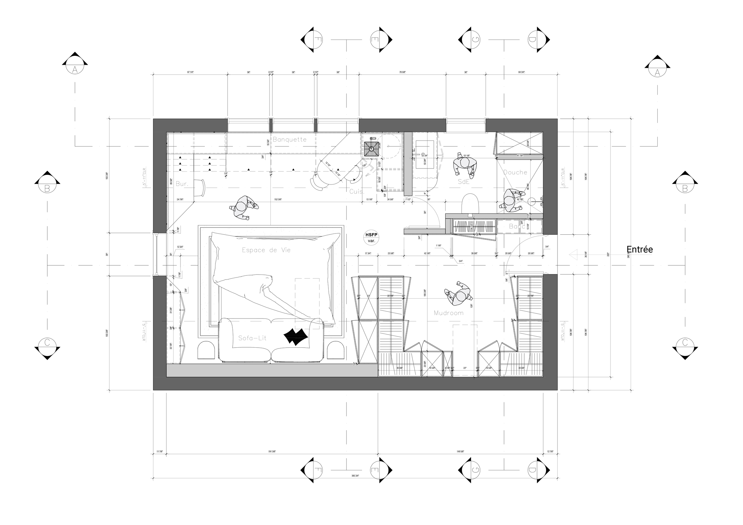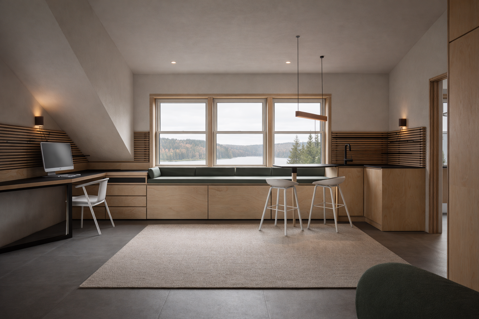 Le projet prend place dans un loft de 49 m² en Gaspésie, dans un territoire marqué par sa nordicité — sa lumière franche, ses paysages dégagés, son climat exigeant. Commandé par un couple, il propose la réorganisation complète d'un volume unique appelé à accueillir, sans cloisonnements superflus, un séjour, une cuisinette, un bureau, un coin nuit pour invités, une mudroom et une salle d'eau.