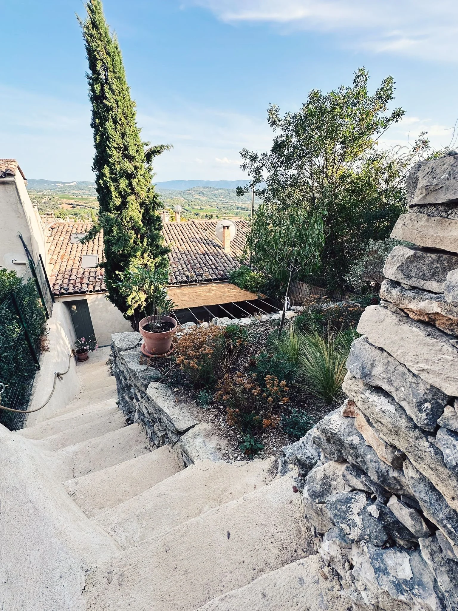 Aménagement du jardin en terrasses avec mise en valeur des murs en pierre sèche, création de niveaux et espaces de vie extérieurs