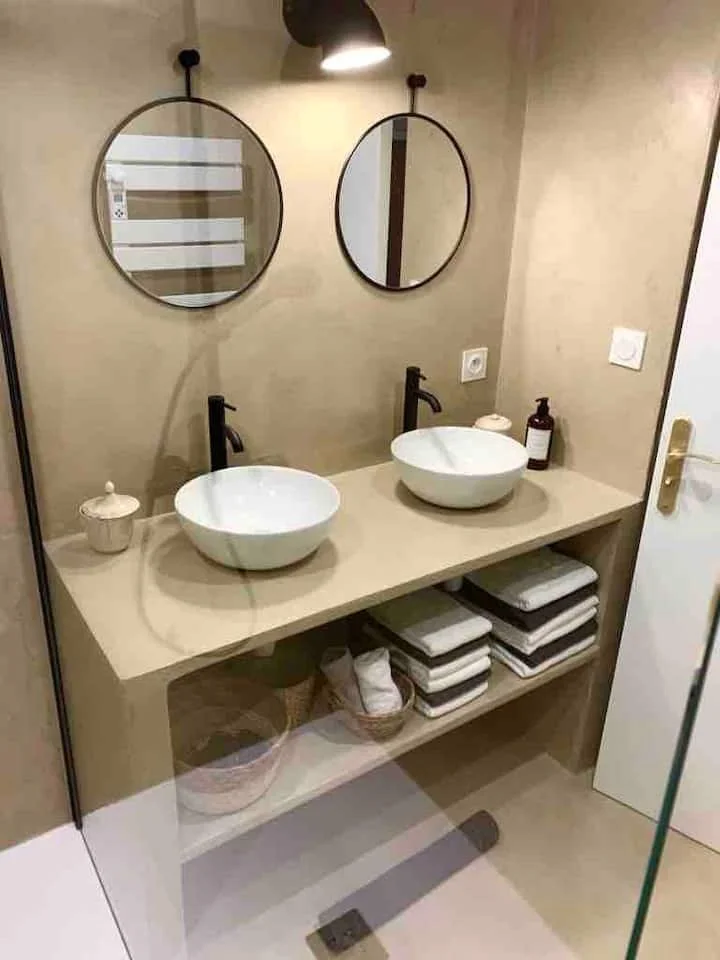 Réfection complète de la salle d’eau : douche à l’italienne, micro-ciment, détails de menuiserie sur mesure